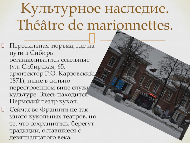 Слайд 11Культурное наследие. Théâtre de marionnettes.