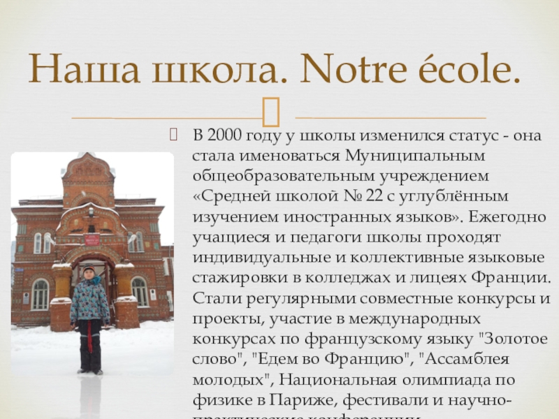она стала именоваться Муниципальным общеобразовательным учреждением «Средней школой № 22 с углублённым изучением иностранных языков». Ежегодно учащиеся и педагоги школы проходят индивидуальные и коллективные языковые стажировки в колледжах и лицеях Франции. Стали регулярными совместные конкурсы и проекты, участие в международных конкурсах по французскому языку "Золотое слово", "Едем во Францию", "Ассамблея молодых", Национальная олимпиада по физике в Париже, фестивали и научно-практические конференции.