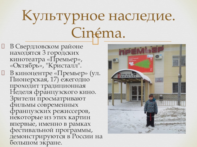 В Свердловском районе находятся 3 городских кинотеатра «Премьер», «Октябрь»,