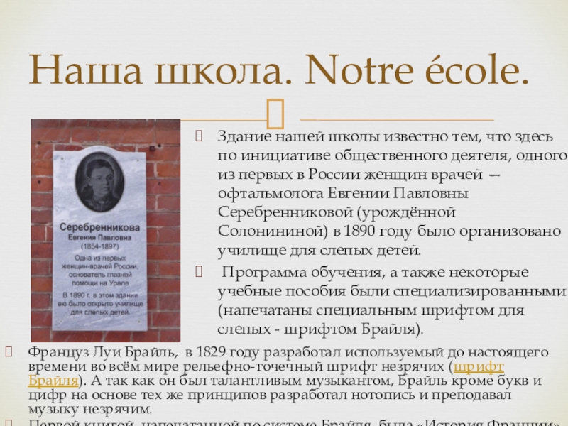 Здание нашей школы известно тем, что здесь по инициативе общественного деятеля, одного из первых в России женщин врачей — офтальмолога Евгении Павловны Серебренниковой (урождённой Солонининой) в 1890 году было организовано училище для слепых детей.