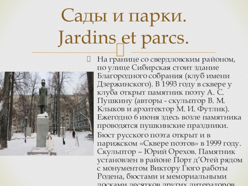 В сквере на улице Чкалова установлен бюст Я. М. Свердлова.