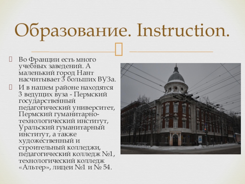 И в нашем районе находятся 3 ведущих вуза - Пермский государственный педагогический университет, Пермский гуманитарно-технологический институт, Уральский гуманитарный институт, а также художественный и строительный колледжи, педагогический колледж №1, технологический колледж «Альтер», лицеи №1 и № 54.