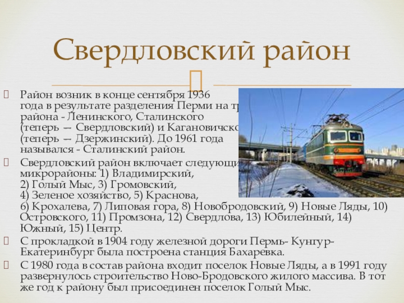 года в результате разделения Перми на три района - Ленинского, Сталинского (теперь — Свердловский) и Кагановичского (теперь — Дзержинский). До 1961 года назывался - Сталинский район.