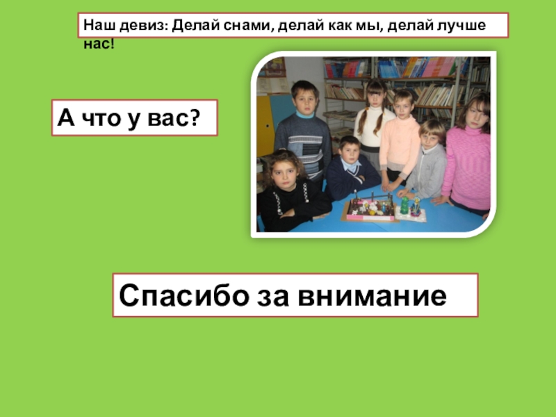 Это сайт презентаций, где можно хранить и обмениваться своими презентациями, докладами, проектами, шаблонами в формате PowerPoint с другими пользователями. Мы помогаем школьникам, студентам, учителям, преподавателям хранить и обмениваться учебными материалами.