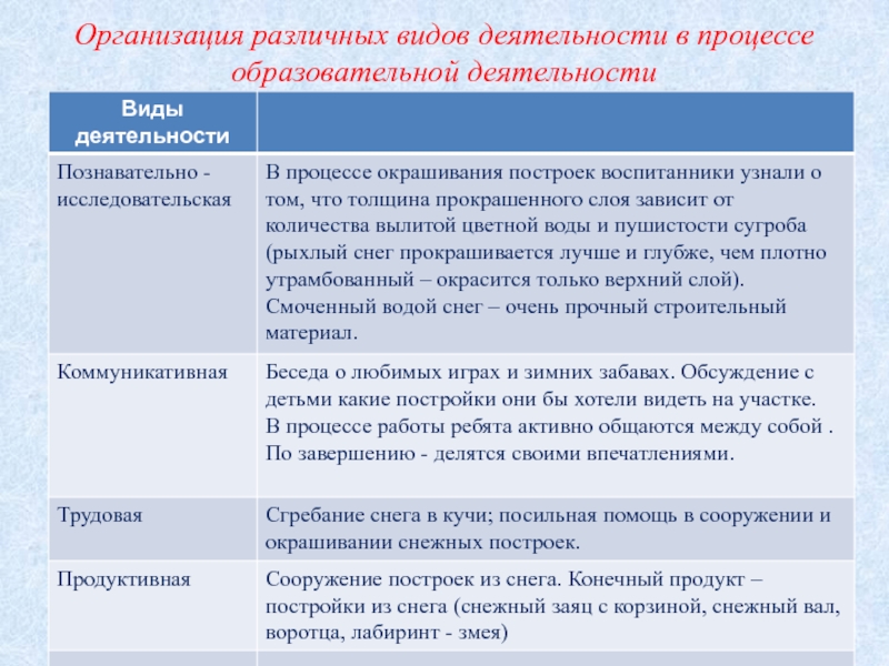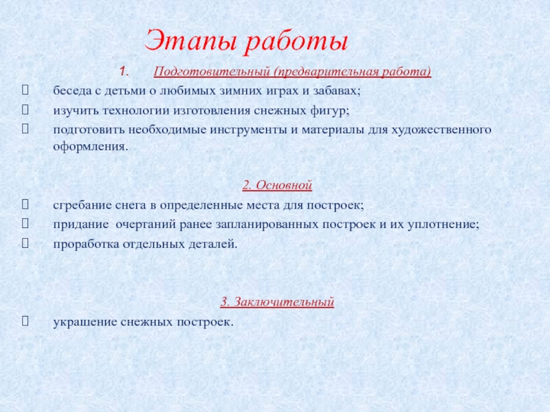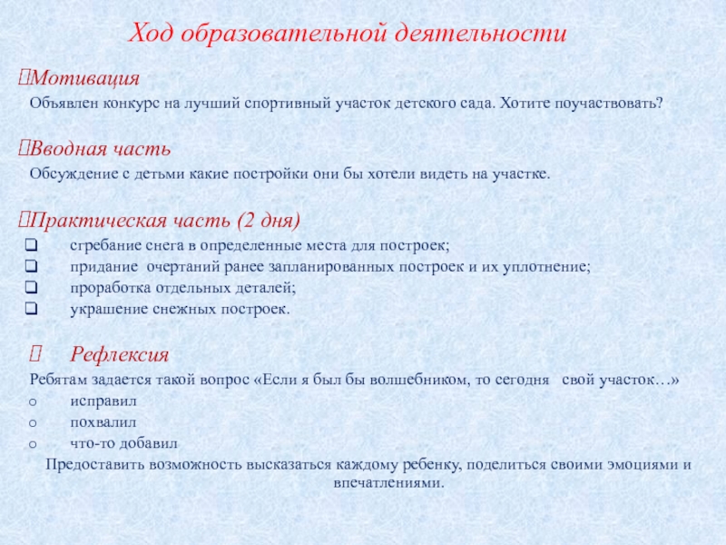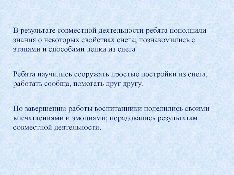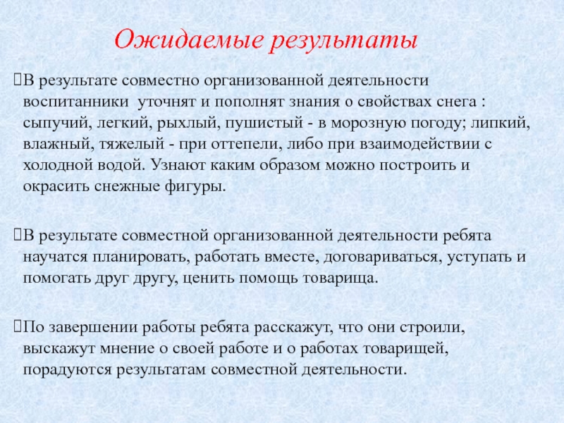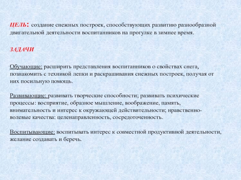 Обучающие: расширить представления воспитанников о свойствах снега, познакомить с техникой лепки и раскрашивания снежных построек, получая от них посильную помощь.