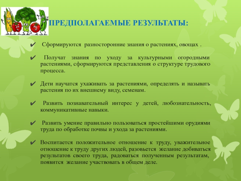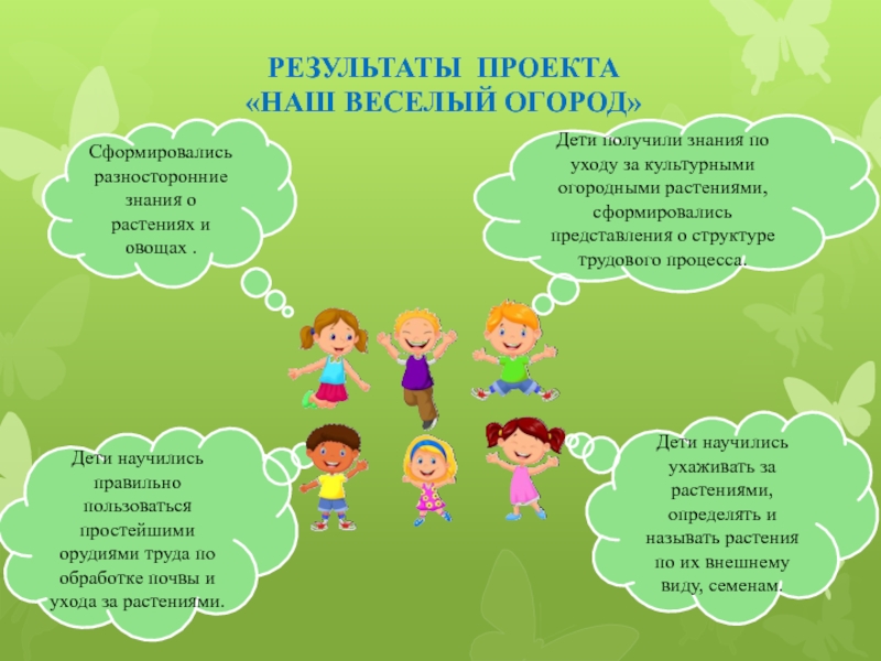 Дети получили знания по уходу за культурными огородными растениями, сформировались представления о структуре трудового процесса.