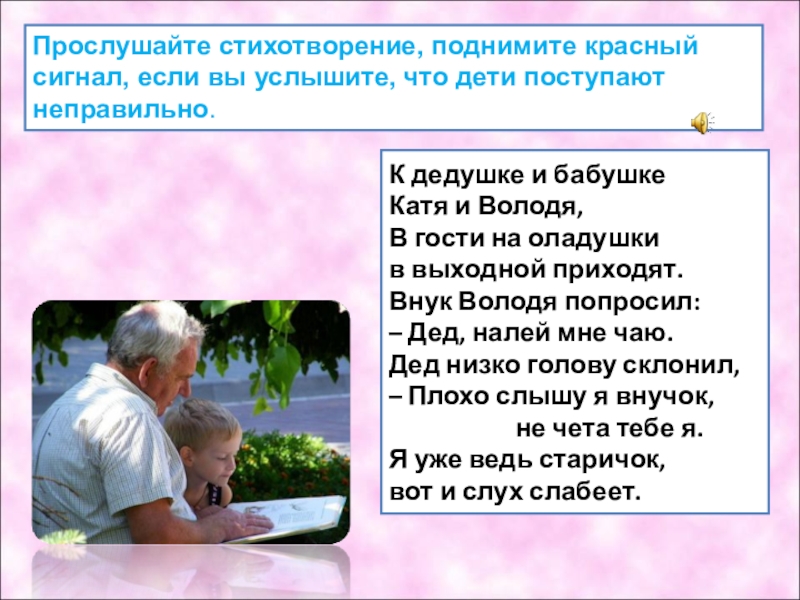 Прослушайте стихотворение, поднимите красный сигнал, если вы услышите, что дети поступают неправильно.