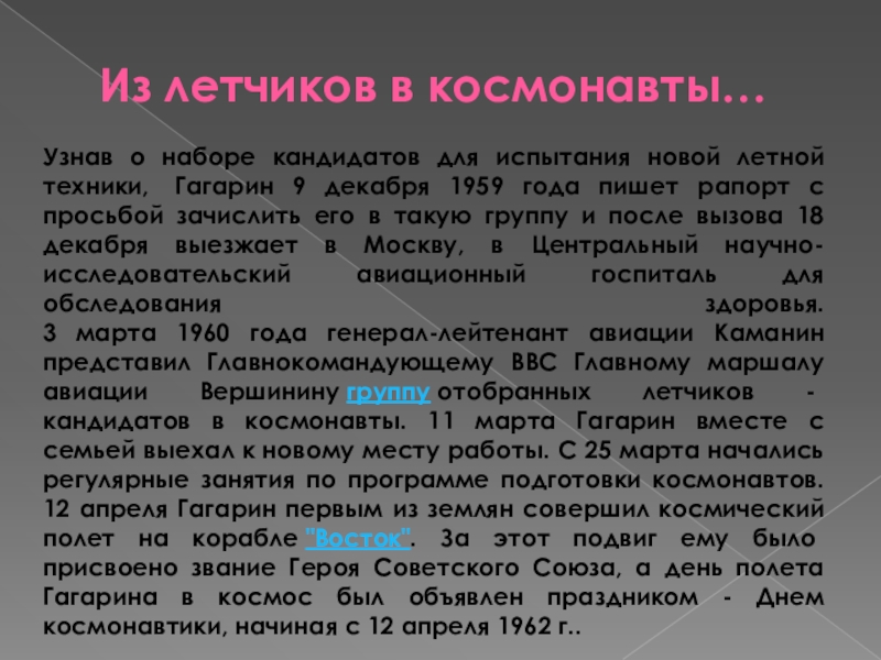 техники,  Гагарин 9 декабря 1959 года пишет рапорт с просьбой зачислить его в такую группу и после вызова 18 декабря выезжает в Москву, в Центральный научно- исследовательский авиационный госпиталь для обследования здоровья. 3 марта 1960 года генерал-лейтенант авиации Каманин представил Главнокомандующему ВВС Главному маршалу авиации Вершинину группу отобранных летчиков - кандидатов в космонавты. 11 марта Гагарин вместе с семьей выехал к новому месту работы. С 25 марта начались регулярные занятия по программе подготовки космонавтов. 12 апреля Гагарин первым из землян совершил космический полет на корабле "Восток". За этот подвиг ему было присвоено звание Героя Советского Союза, а день полета Гагарина в космос был объявлен праздником - Днем космонавтики, начиная с 12 апреля 1962 г..
