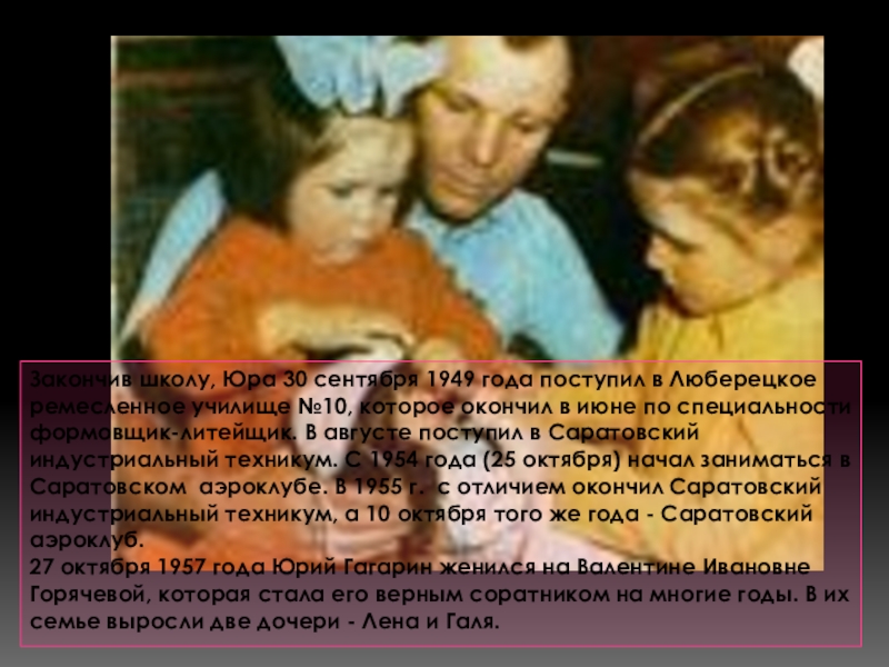 Люберецкое ремесленное училище №10, которое окончил в июне по специальности формовщик-литейщик. В августе поступил в Саратовский индустриальный техникум. С 1954 года (25 октября) начал заниматься в Саратовском аэроклубе. В 1955 г.  с отличием окончил Саратовский индустриальный техникум, а 10 октября того же года - Саратовский аэроклуб. 27 октября 1957 года Юрий Гагарин женился на Валентине Ивановне Горячевой, которая стала его верным соратником на многие годы. В их семье выросли две дочери - Лена и Галя.