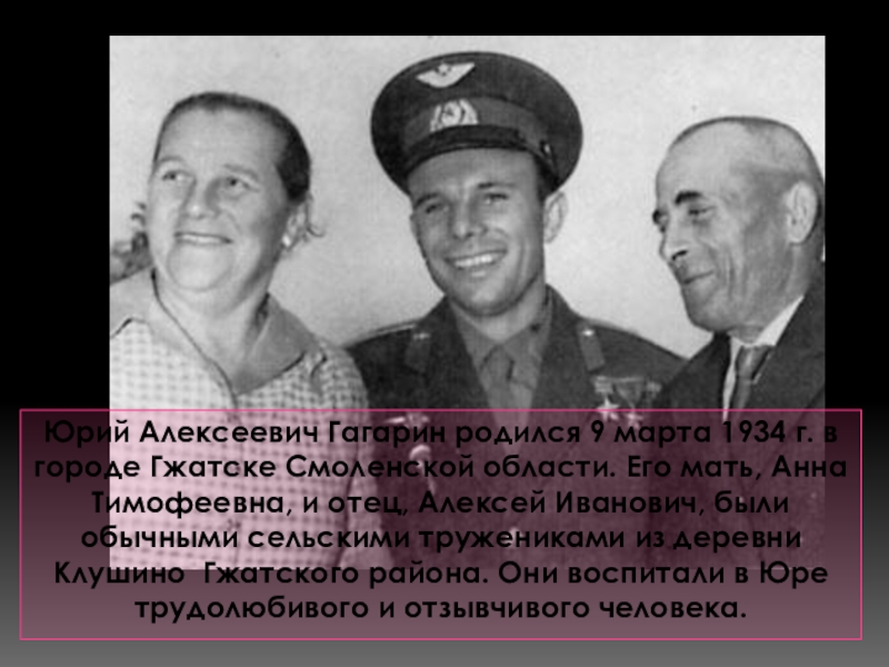 РодителиЮрий Алексеевич Гагарин родился 9 марта 1934 г. в городе Гжатске Смоленской области. Его мать, Анна Тимофеевна,