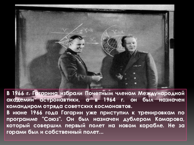 В 1966 г. Гагарина избрали Почетным членом Международной академии астронавтики, а в 1964 г. он был назначен
