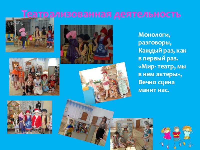 Театрализованная деятельностьМонологи, разговоры,Каждый раз, как в первый раз.«Мир- театр, мы в нем актеры»,Вечно сцена манит нас.