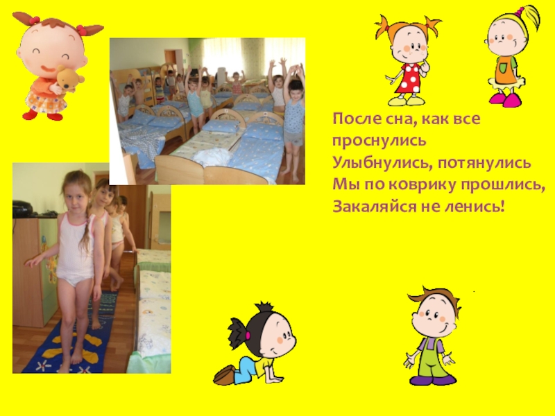 После сна, как все проснулисьУлыбнулись, потянулисьМы по коврику прошлись,Закаляйся не ленись!