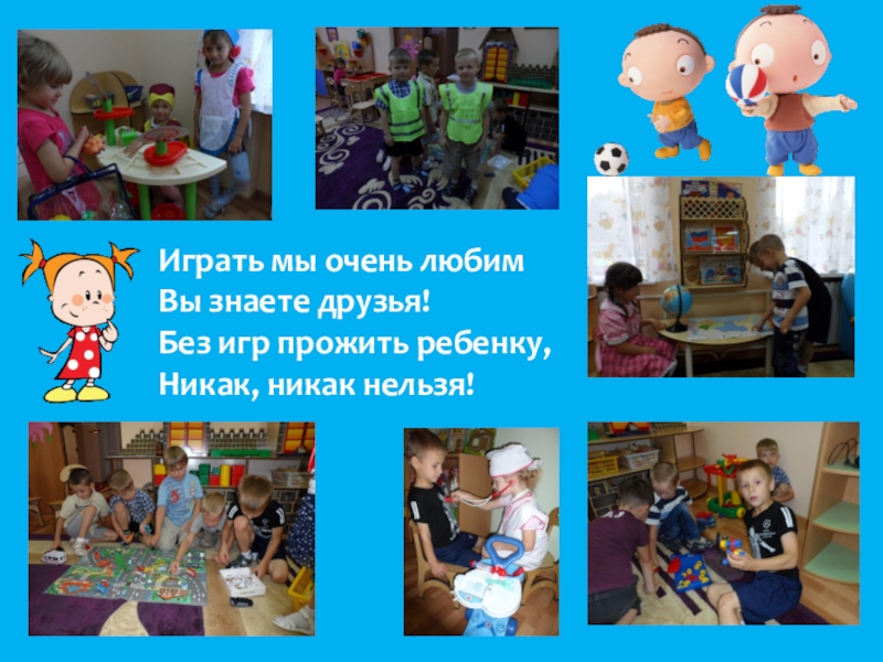 Играть мы очень любимВы знаете друзья!Без игр прожить ребенку,Никак, никак нельзя!