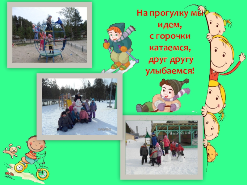 Слайд 13На прогулку мы идем, с горочки катаемся, друг другу улыбаемся!