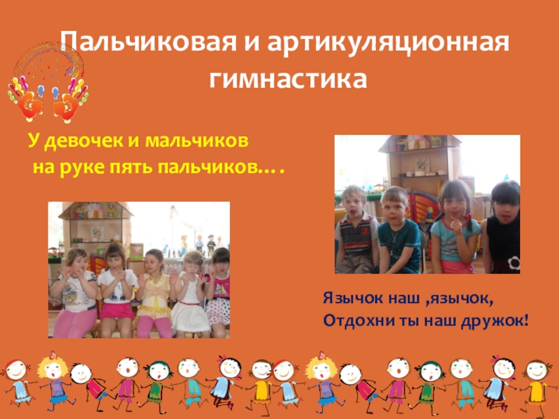 Пальчиковая и артикуляционная гимнастикаУ девочек и мальчиков на руке пять пальчиков….Язычок наш ,язычок,Отдохни ты наш дружок!