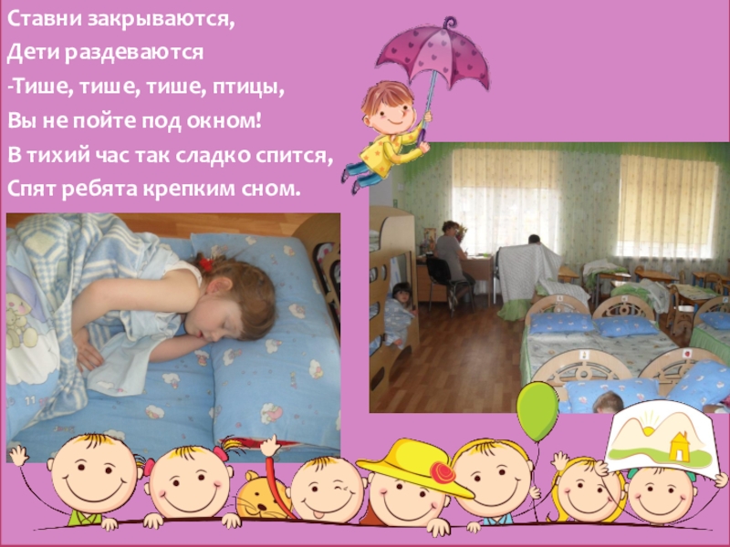 Ставни закрываются,Дети раздеваются-Тише, тише, тише, птицы,Вы не пойте под окном!В тихий час так сладко спится,Спят ребята крепким