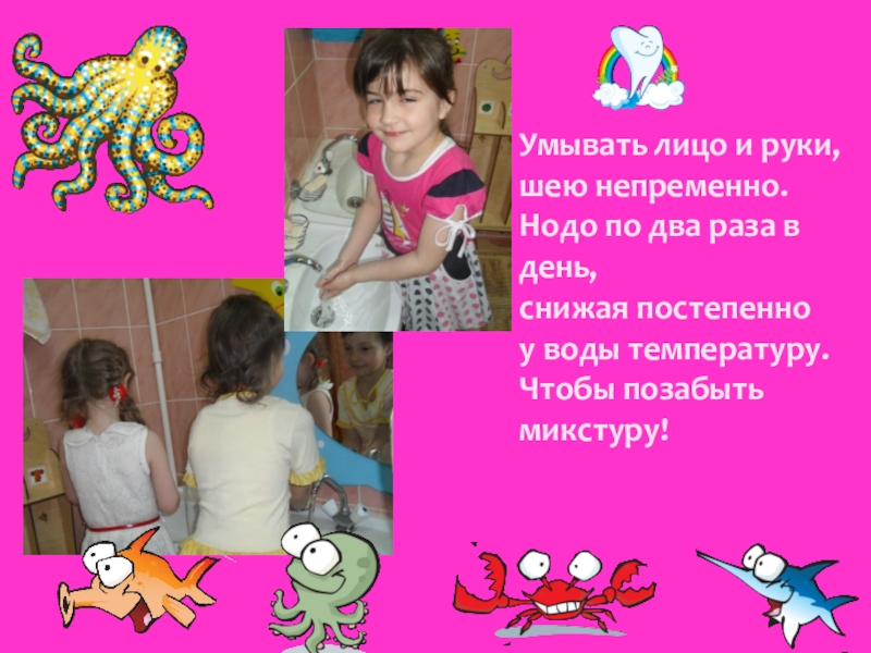 Слайд 17Умывать лицо и руки, шею непременно. Нодо по два раза в день, снижая постепенно у