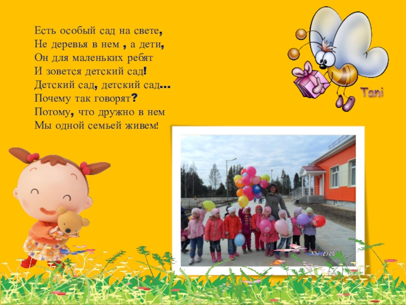 Есть особый сад на свете,Не деревья в нем , а дети,Он для маленьких ребятИ зовется детский сад!Детский