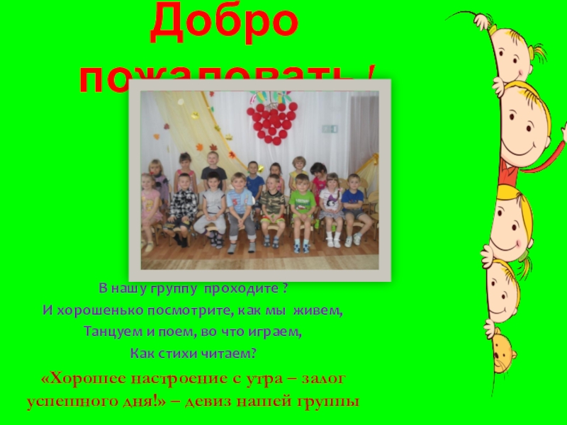 Добро пожаловать!В нашу группу проходите ?И хорошенько посмотрите, как мы живем, Танцуем и поем, во что играем,