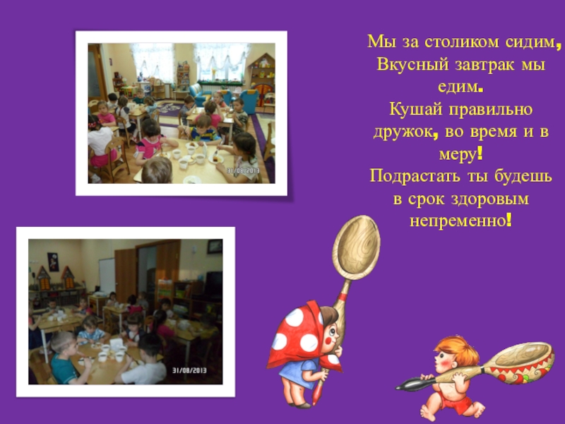 Мы за столиком сидим, Вкусный завтрак мы едим. Кушай правильно дружок, во время и в меру! Подрастать