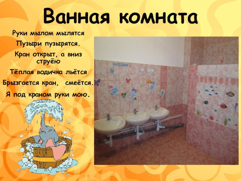 Ванная комнатаРуки мылом мылятсяПузыри пузырятся.Кран открыт, а вниз струёю Тёплая водичка льётсяБрызгается кран,  смеётся.Я под краном руки мою.