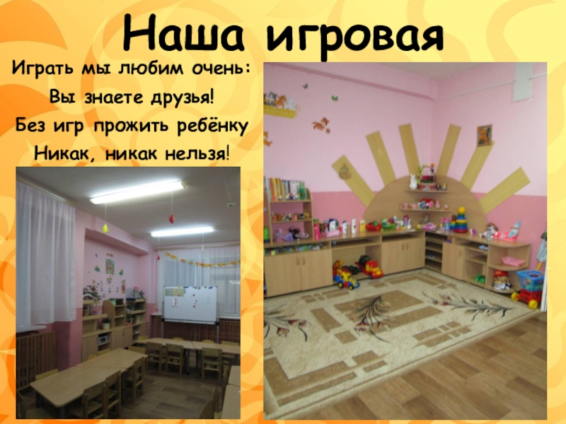 Наша игроваяИграть мы любим очень:Вы знаете друзья!Без игр прожить ребёнкуНикак, никак нельзя!