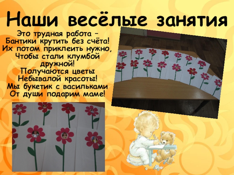 Наши весёлые занятияЭто трудная работа – Бантики крутить без счёта! Их потом приклеить нужно, Чтобы стали клумбой