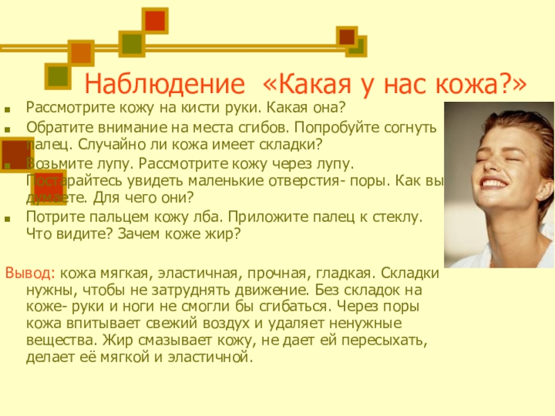 Вывод: кожа мягкая, эластичная, прочная, гладкая. Складки нужны, чтобы не затруднять движение. Без складок на коже- руки и ноги не смогли бы сгибаться. Через поры кожа впитывает свежий воздух и удаляет ненужные вещества. Жир смазывает кожу, не дает ей пересыхать, делает её мягкой и эластичной.