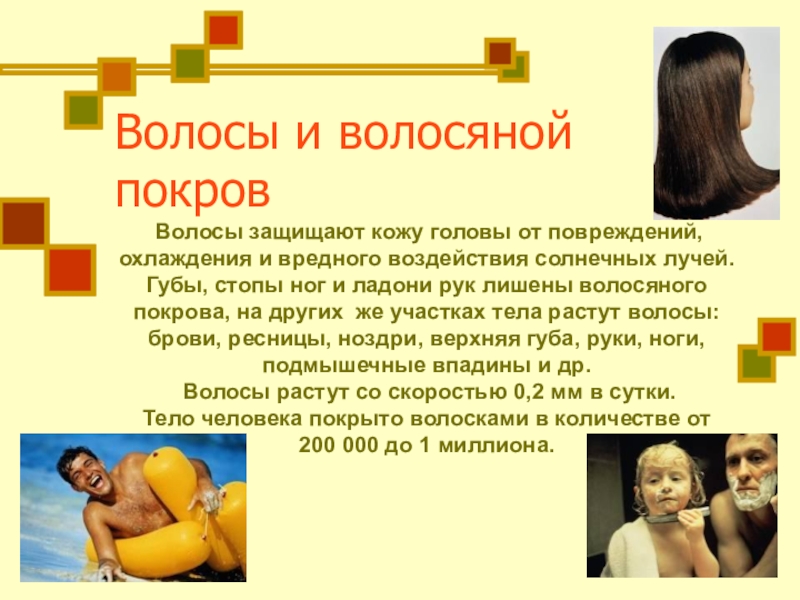 и вредного воздействия солнечных лучей. Губы, стопы ног и ладони рук лишены волосяного покрова, на других же участках тела растут волосы: брови, ресницы, ноздри, верхняя губа, руки, ноги, подмышечные впадины и др.