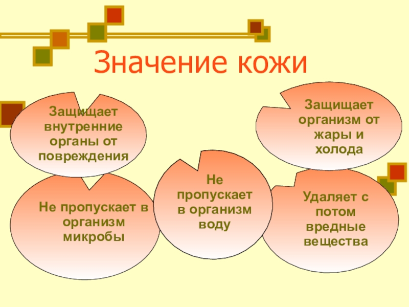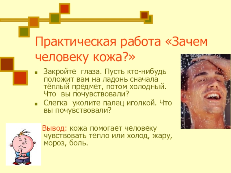 Вывод: кожа помогает человеку чувствовать тепло или холод, жару, мороз, боль.