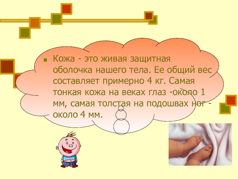 составляет примерно 4 кг. Самая тонкая кожа на веках глаз -около 1 мм, самая толстая на подошвах ног -около 4 мм.
