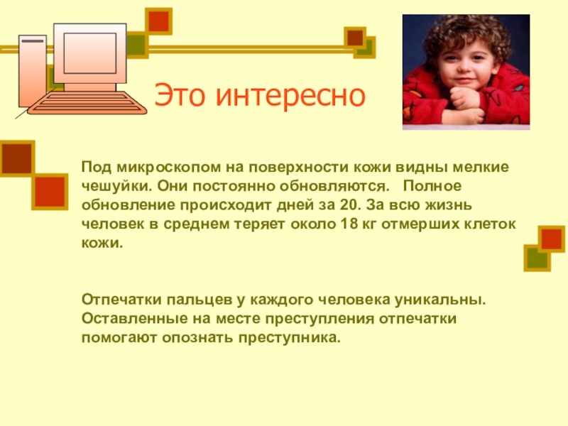 мелкие чешуйки. Они постоянно обновляются. Полное обновление происходит дней за 20. За всю жизнь человек в среднем теряет около 18 кг отмерших клеток кожи.