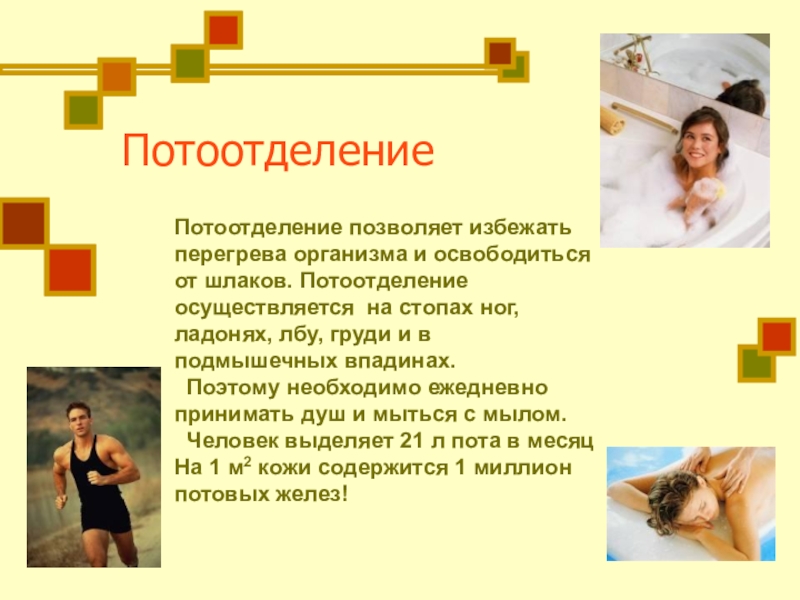 Человек выделяет 21 л пота в месяц На 1 м2 кожи содержится 1 миллион потовых желез!