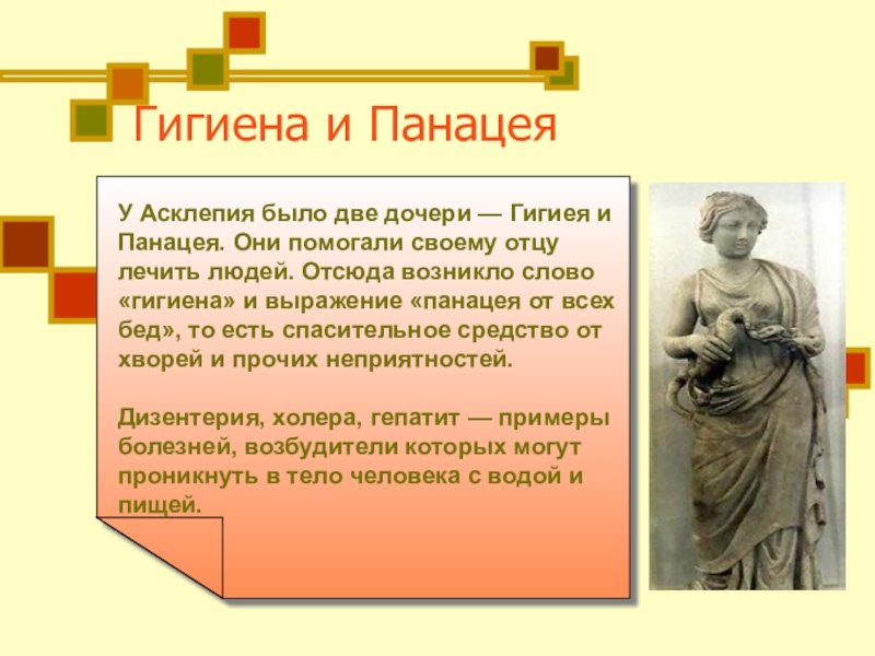 Панацея. Они помогали своему отцу лечить людей. Отсюда возникло слово «гигиена» и выражение «панацея от всех бед», то есть спасительное средство от хворей и прочих неприятностей.