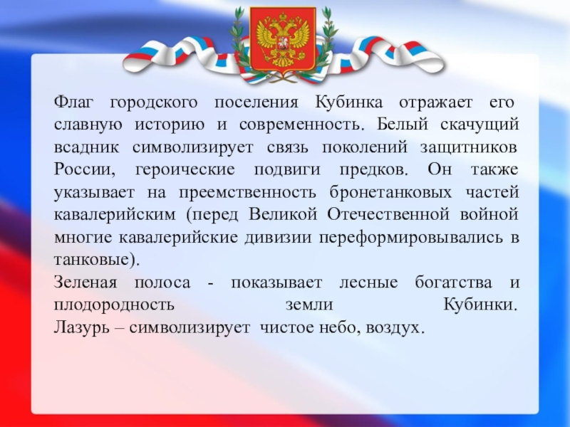 Слайд 11Флаг городского поселения Кубинка отражает его славную историю и современность. Белый