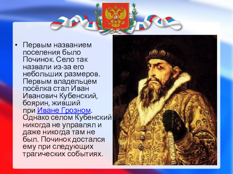 размеров. Первым владельцем посёлка стал Иван Иванович Кубенский, боярин, живший при Иване Грозном. Однако селом Кубенский никогда не управлял и даже никогда там не был. Починок достался ему при следующих трагических событиях.