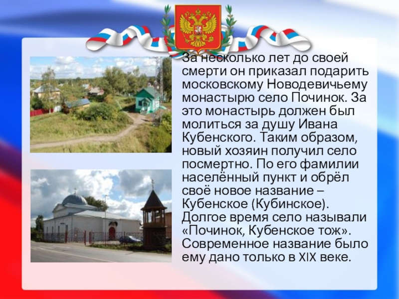 Слайд 4Первым названием поселения было Починок. Село так назвали из-за его небольших