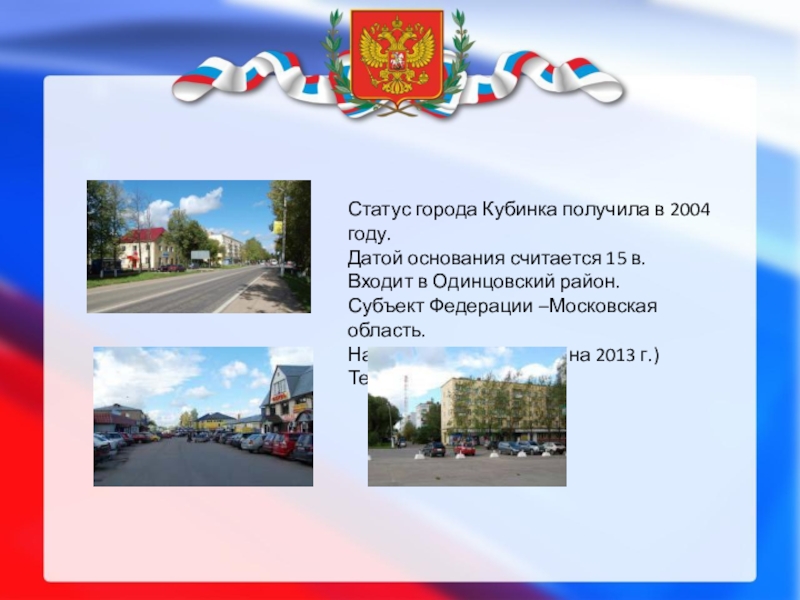 Слайд 2Статус города Кубинка получила в 2004 году.