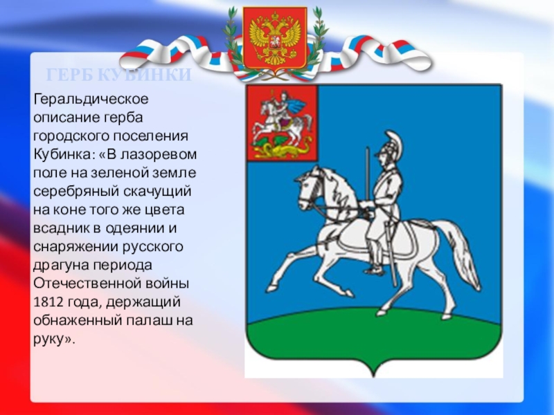 ГЕРБ КУБИНКИГеральдическое описание герба городского поселения Кубинка: «В лазоревом поле на зеленой земле серебряный скачущий на коне
