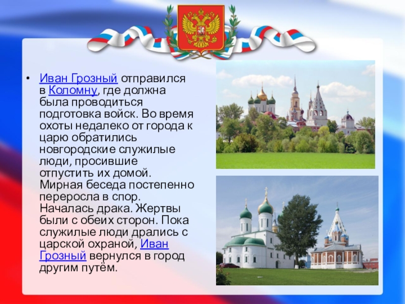 Слайд 5Иван Грозный отправился в Коломну, где должна была проводиться подготовка войск. Во время