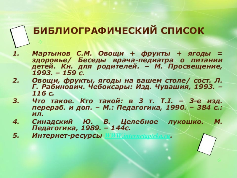 Овощи, фрукты, ягоды на вашем столе/ сост. Л. Г. Рабинович. Чебоксары: Изд. Чувашия, 1993. – 116 с.