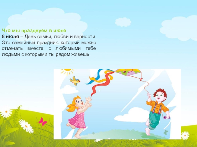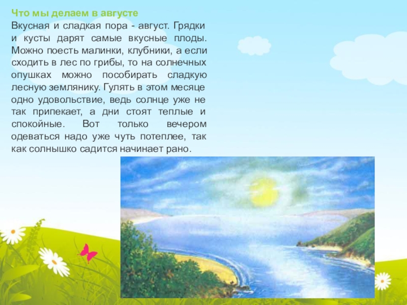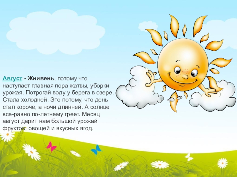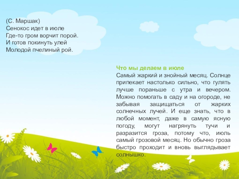 Самый жаркий и знойный месяц. Солнце припекает настолько сильно, что гулять лучше пораньше с утра и вечером. Можно помогать в саду и на огороде, не забывая защищаться от жарких солнечных лучей. И еще знать, что в любой момент, даже в самую ясную погоду, могут нагрянуть тучи и разразится гроза, потому что, июль самый грозовой месяц. Но обычно гроза быстро проходит и вновь выглядывает солнышко.