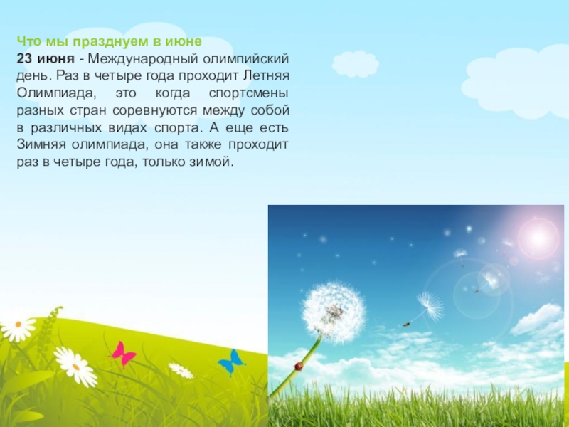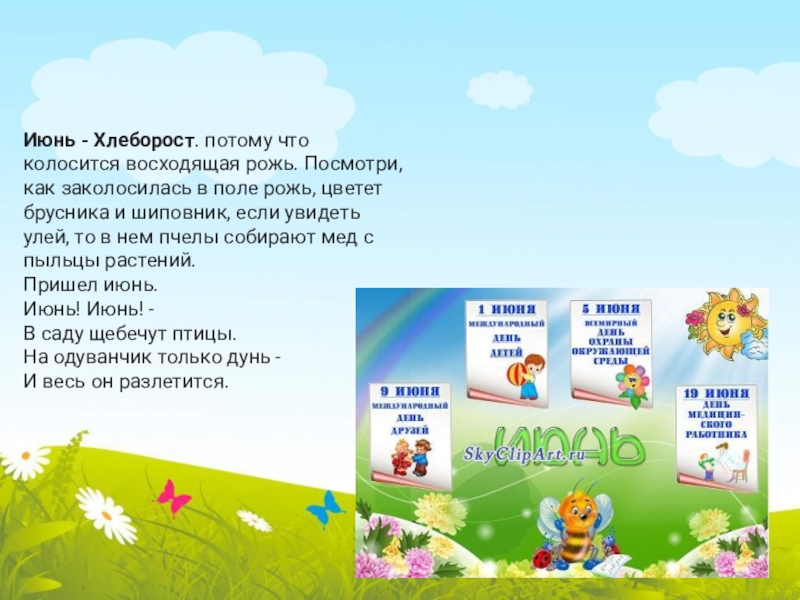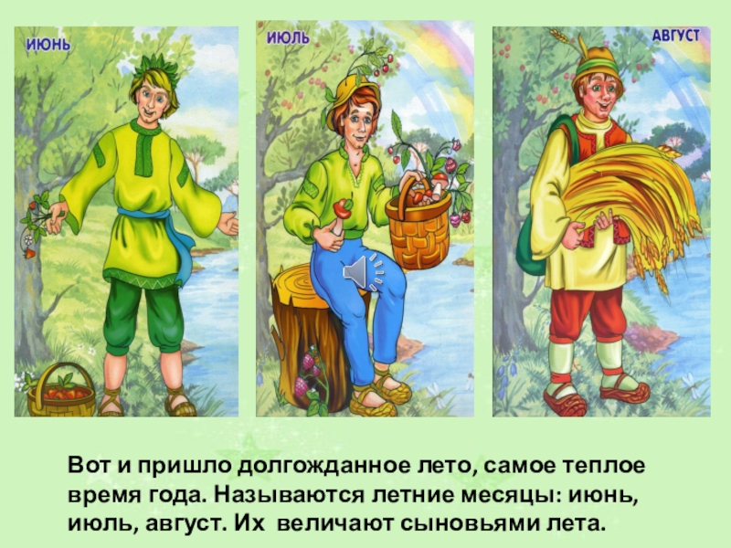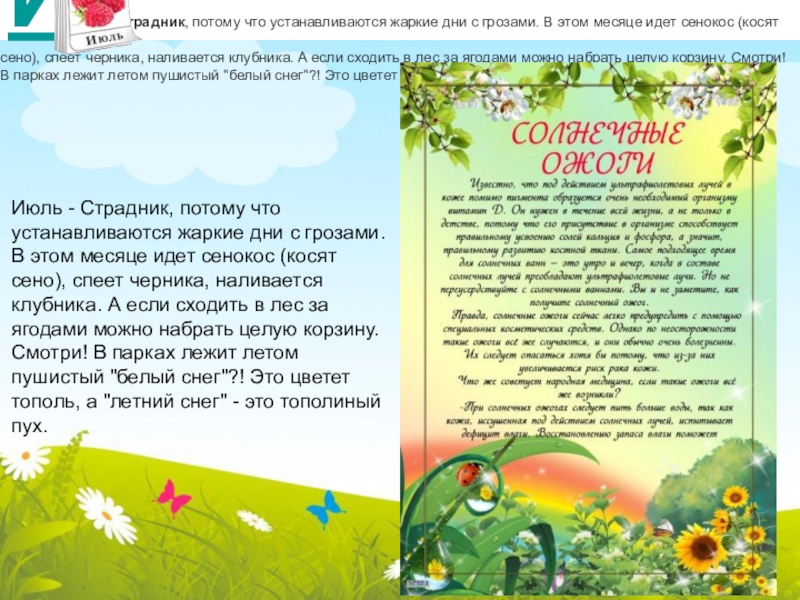 Июль - Страдник, потому что устанавливаются жаркие дни с грозами. В этом месяце идет сенокос (косят сено), спеет черника, наливается клубника. А если сходить в лес за ягодами можно набрать целую корзину. Смотри! В парках лежит летом пушистый "белый снег"?! Это цветет тополь, а "летний снег" - это тополиный пух.