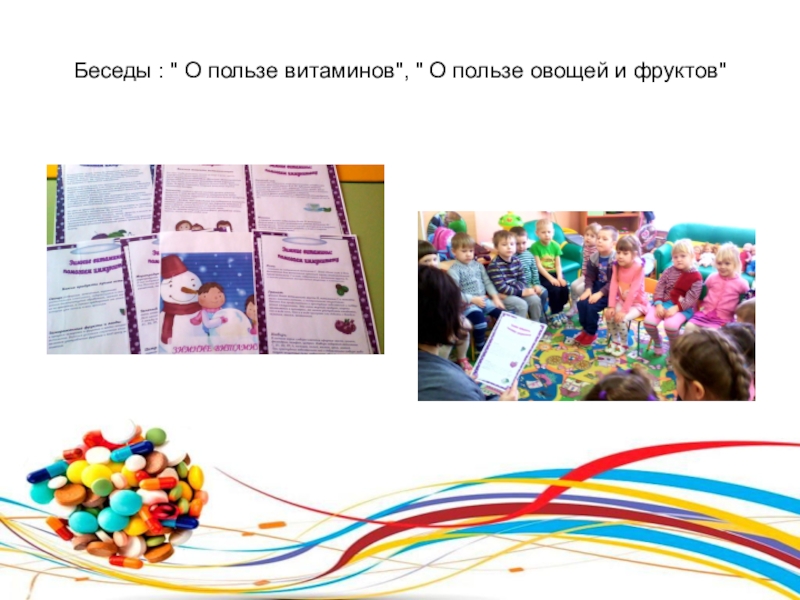 1. Дать представление о витаминах и продуктах, в которых содержится их наибольшее количество. Познакомить детей с группами витаминов. Формировать представления о том, какие продукты полезные, какие продукты полезные, какие вредные.