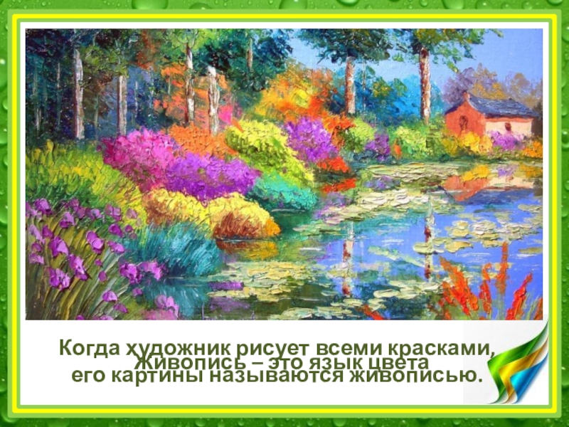 Слайд 9Когда художник рисует всеми красками, его картины называются живописью.