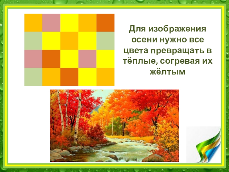 Слайд 11Для изображения осени нужно все цвета превращать в тёплые, согревая их