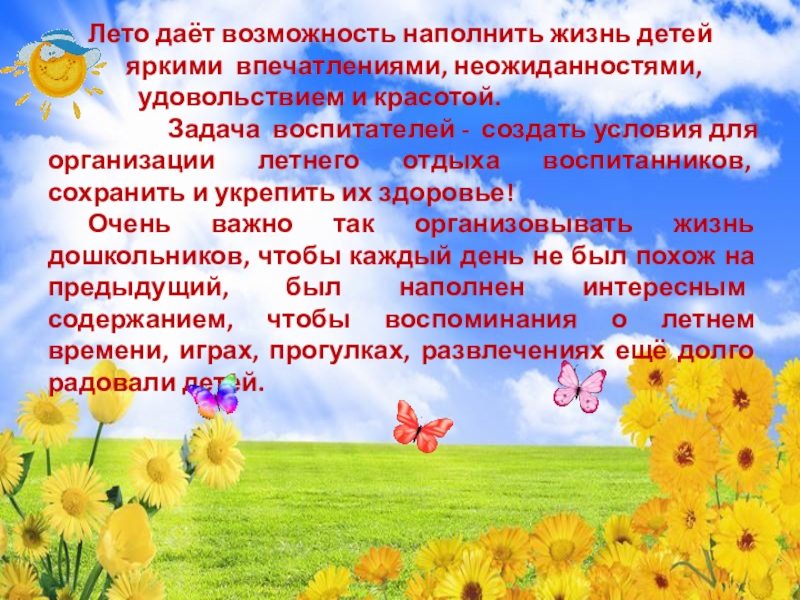 Очень важно так организовывать жизнь дошкольников, чтобы каждый день не был похож на предыдущий, был наполнен интересным содержанием, чтобы воспоминания о летнем времени, играх, прогулках, развлечениях ещё долго радовали детей.