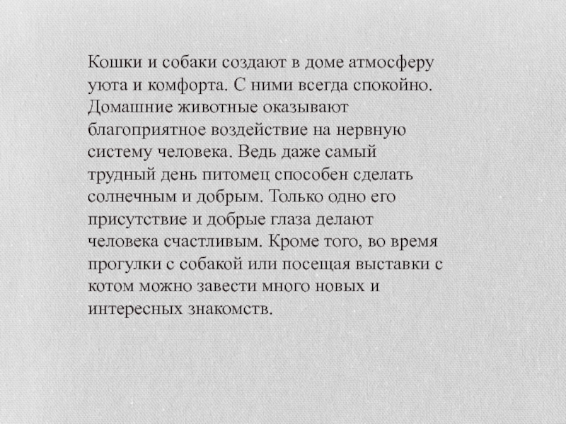 ними всегда спокойно. Домашние животные оказывают благоприятное воздействие на нервную систему человека. Ведь даже самый трудный день питомец способен сделать солнечным и добрым. Только одно его присутствие и добрые глаза делают человека счастливым. Кроме того, во время прогулки с собакой или посещая выставки с котом можно завести много новых и интересных знакомств.