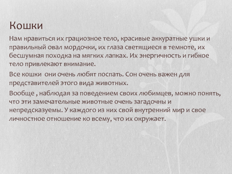 мордочки, их глаза светящиеся в темноте, их бесшумная походка на мягких лапках. Их энергичность и гибкое тело привлекают внимание.